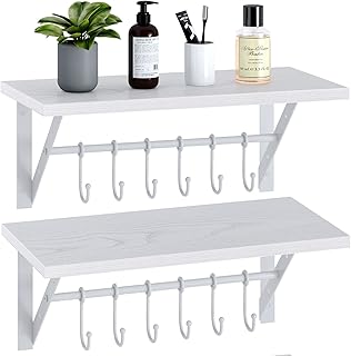 Greenstell フローティングシェルフ 壁掛け棚 2個セット 壁棚 タオルホルダー2個&フック12個付き 多機能収納棚 素朴な木製装飾棚 バスルーム リビングルーム (ホワイト 15.75インチ)